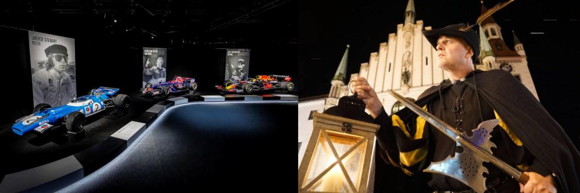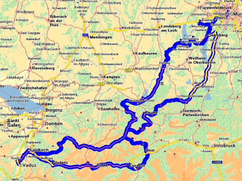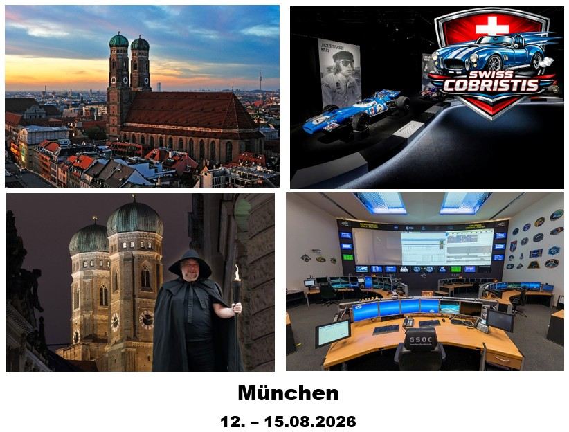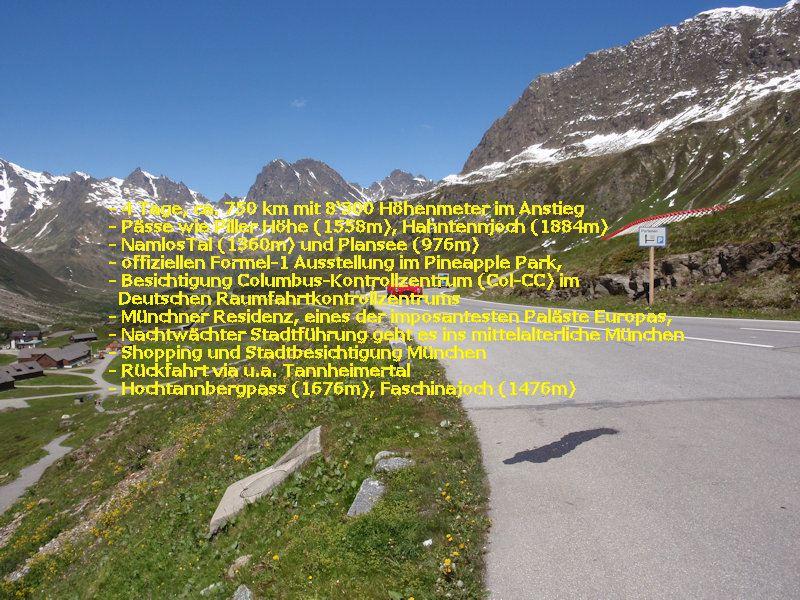(4 Tage, ca. 750 km mit 8‘300 Höhenmeter im Anstieg; Pässe wie Piller Höhe (1558m), Hahntennjoch (1884m), NamlosTal (1360m) und Plansee (976m) auf der Anfahrt; offizielle Formel-1 Ausstellung im Pineapple Park; Besichtigung Columbus-Kontrollzentrum (Col-CC) im Deutschen Raumfahrtkontrollzentrum;Münchner Residenz, eines der imposantesten Paläste Europas; Nachtwächter Stadtführung geht es ins mittelalterliche München; Shopping und Stadtbesichtigung München; Rückfahrt via u.a. Tannheimertal, Hochtannbergpass (1676m), Faschinajoch (1476m))