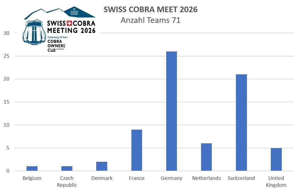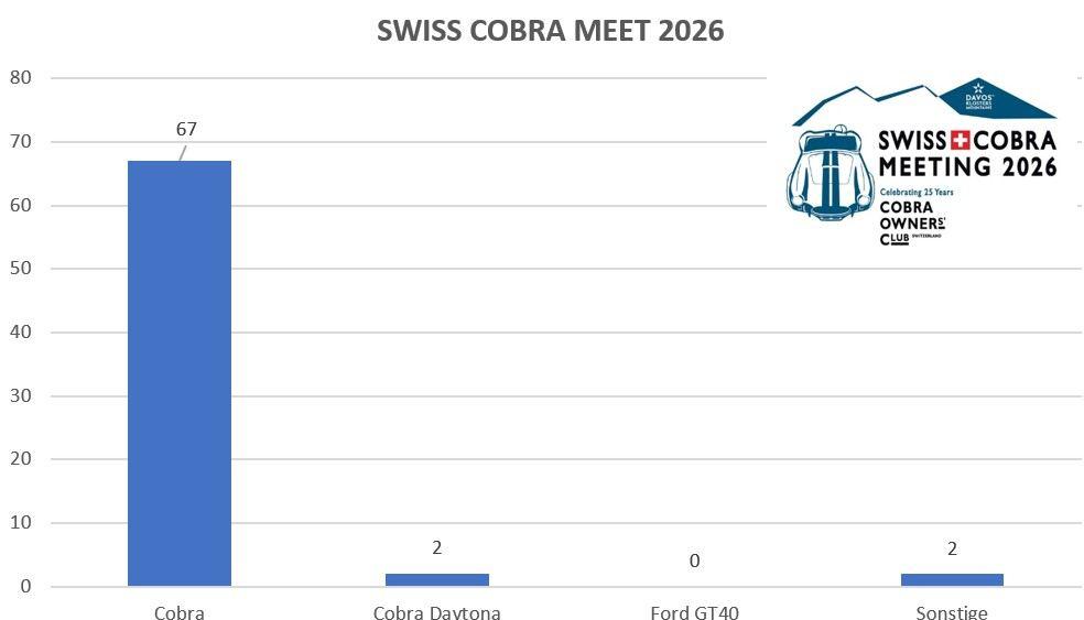 Le Cobra Owners' Club Switzerland fêtera son 25e anniversaire en 2026. Après le succès d'un meeting européen Cobra à Davos en 2018 et d'un Carroll Shelby Centennial Switzerland en 2023, le temps est venu d'organiser un "SWISS COBRA MEETING" (SCM), sous la forme d'un meeting de 4 jours avec une option Early Bird pour célébrer l'anniversaire du club. Nous nous adressons aux pilotes de Cobra, Cobra Daytona, GT40. Le club invite tous les Cobristis, même de l'étranger, à venir faire la fête avec lui et à passer 4 jours inoubliables à Davos. L'accent sera mis sur les passages de cols et les discussions sur l'essence autour d'un thème commun à tous : "Carroll Shelby et la Cobra ou la GT40". Notre événement se déroulera dans un hôtel déjà connu de nombreux Cobristis, mais qui a changé de propriétaire, passant du groupe Sunstar aux Davos Klosters Bergbahnen.