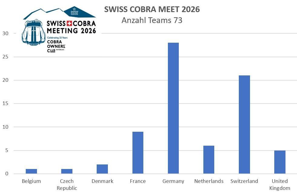 Le Cobra Owners' Club Switzerland fêtera son 25e anniversaire en 2026. Après le succès d'un meeting européen Cobra à Davos en 2018 et d'un Carroll Shelby Centennial Switzerland en 2023, le temps est venu d'organiser un "SWISS COBRA MEETING" (SCM), sous la forme d'un meeting de 4 jours avec une option Early Bird pour célébrer l'anniversaire du club. Nous nous adressons aux pilotes de Cobra, Cobra Daytona, GT40. Le club invite tous les Cobristis, même de l'étranger, à venir faire la fête avec lui et à passer 4 jours inoubliables à Davos. L'accent sera mis sur les passages de cols et les discussions sur l'essence autour d'un thème commun à tous : "Carroll Shelby et la Cobra ou la GT40". Notre événement se déroulera dans un hôtel déjà connu de nombreux Cobristis, mais qui a changé de propriétaire, passant du groupe Sunstar aux Davos Klosters Bergbahnen.