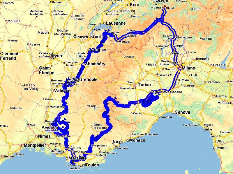 (11 Tage, ca. 2’200 km und ca. 30'000 Höhenmeter, Chartreuse-Pässestraße, Schluchten Georges de Bourne, Gorges de Daluis und Gorges du Nan, Col de la Machine, Übernachtung, Dinner und Weinprobe in der Domaine de Cabasse, die malerische Calanque-Küste mit Bootsausflug und Schnorcheln, La Ciotat, Cassis, Rte des Crêtes, Cap Canaille, Grand Canyon du Verdon mit Route des Crête, Mont Ventoux (1841m), Gorges de la Nesque, Col de Vars (2109m), Col d'Agnel (2746m), Degustation im Shop der Domaine du Pégau in Châteauneuf-du-Pape, Besuch beim König der kandierten Früchte im Luberon, Mittagessen in der Osteria Veglio in La Morra, Besichtigung und Degustation bei Destilleria Berta, Marktbesuch Alba)