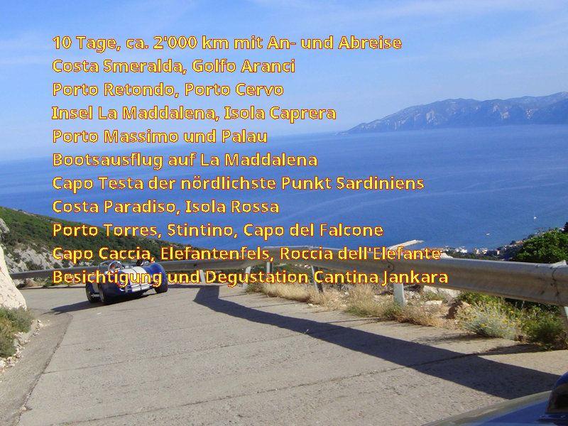 (10 Tage, ca. 2'000 km mit An- und Abreise, Costa Smeralda, Golfo Aranci, Porto Retondo, Porto Cervo, Insel La Maddalena, Isola Caprera, Porto Massimo und Palau, Bootsausflug auf La Maddalena, Capo Testa der nördlichste Punkt Sardiniens, Costa Paradiso, Isola Rossa, Porto Torres, Stintino, Capo del Falcone, Capo Caccia, Elefantenfels, Roccia dell'Elefante, Besichtigung und Degustation Cantina Jankara)